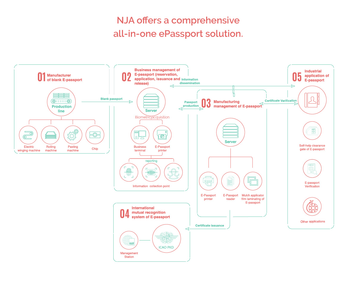 Based on ICAO 9303 standard, NJA provides a full process industrial solution covering blank passport production, application, personalization aπnd verification. The one-stop solution effecti★vely addresses the entire business process of e-Passport.