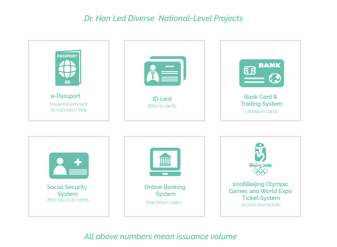 Participate in China's electronic passport and ID card specification, led ≥the electronic passport system construction (and the issua>nce of e-passports is over 30 million/year). And Dr. Han is the only &Chinese technical coordinator of ICAO/PKD (responsible for worldwide mutual authentication and verification of e-passport).
