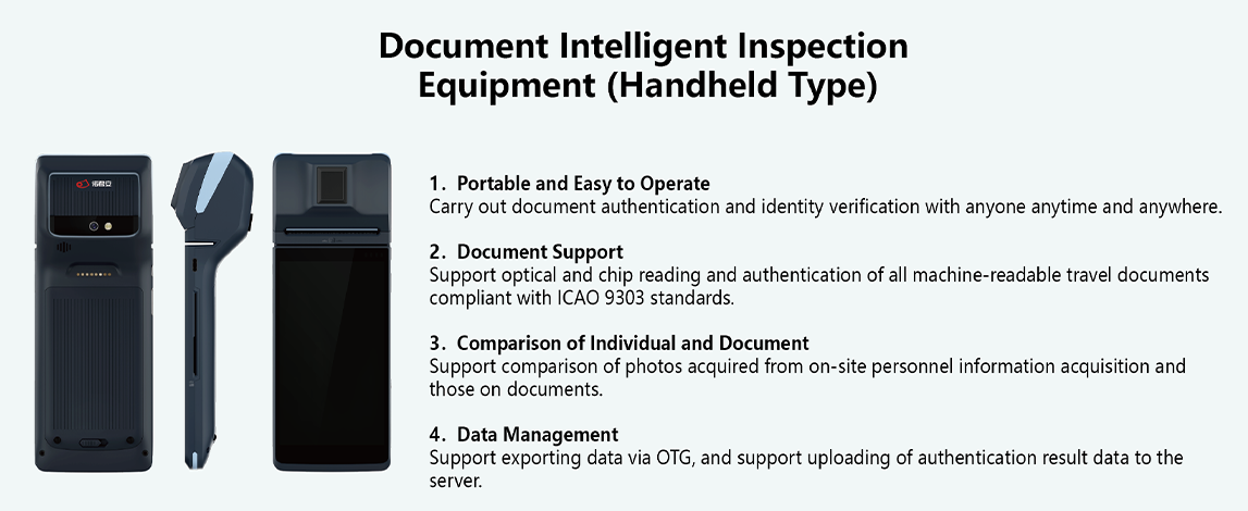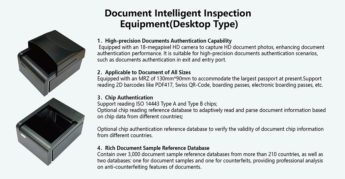 The document intelligent inspection equipment realize documents authority identification based on optical inspection, chip inspection technology. The equipment mainly used in exit-entry inspection, visa inspection at embassie s and consulates, check-in at hotels, customs inspection, a∏nd passenger information acquisition for international arrivals.